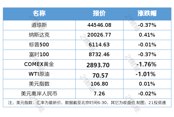 纽约股市三大股指2月14日涨跌不一。截至2月14日收盘,道琼斯工业平均指数比前一交易日下跌165.35点,收于44546.08点,跌幅为0.37%;标准普尔500种股票指数下跌0.44点,收于6114.63点,跌幅为0.01%;纳斯达克综合指数上涨81.13点,收于20026.77点,涨幅为0.41%。